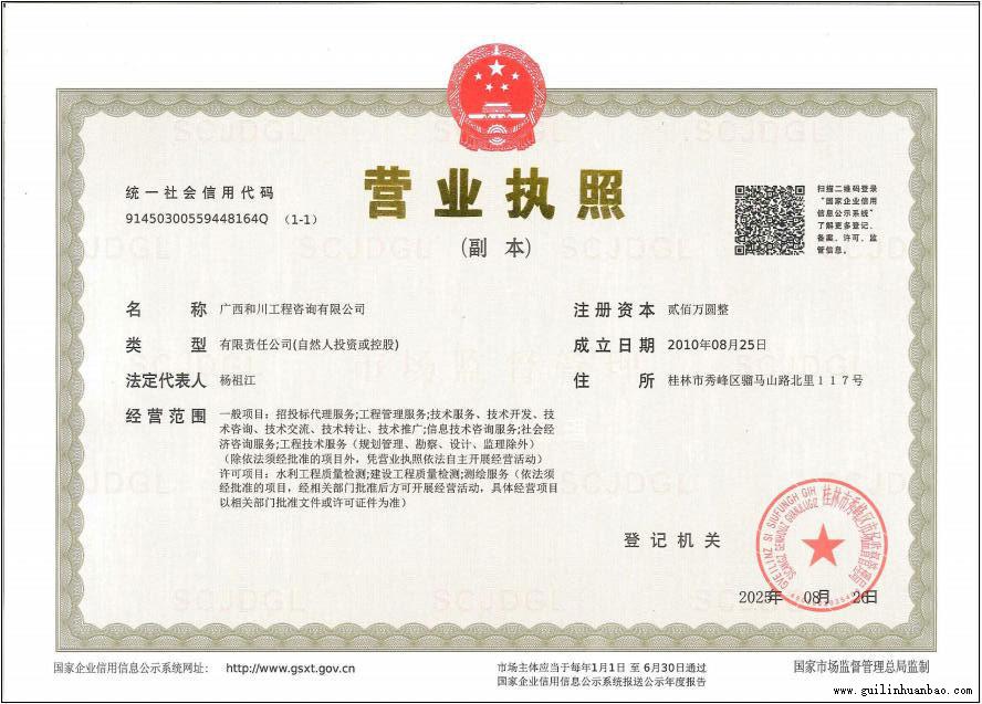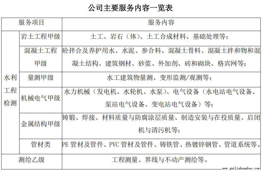 本公司具备广西壮族自治区市场监督管理局批准颁发的检验检测机构资质认定证书,可向社会出具具有证明作用的数据和结果。本公司具备中华人民共和国水利部批准颁发的水利工程岩土工程甲级、混凝土工程甲级、量测甲级、机械电气甲级、金属结构甲级全类别检测资质证书,是广西第一家也是目前唯一一家民营企业取得水利工程质量检测“五甲”资质的单位。此外,本公司还取得了管材类检测资质,均已在广西壮族自治区水利厅备案。本公司具有专业的水利检测技术团队,先进的仪器设备,丰富的检测经验,旨在全方位为水利工程质量保驾护航。自 2020 年以来连续多年获得广西水利水电工程质量检测协会授予“全区水利工程质量检测先进单位”的光荣称号。