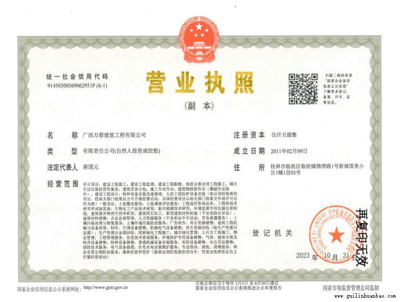 广西万都建筑工程有限公司,公司于2011年成立,注册资金5000万元,目前具有房屋建筑工程总承包二级、地基基础工程专业承包二级、起重设备安装工程专业承包二级、消防设施工程专业承包二级、钢结构工程专业承包二级、建筑装修装饰工程专业承包二级、建筑机电安装工程专业承包二级、建筑幕墙工程专业承包二级、古建筑工程专业承包二级;市政公用工程总承包三级、水利水电工程总承包三级、模板与脚手架工程专业承包、园林绿化工程施工等资质。具有房地产开发二级资质。林业有害生物防治服务甲级资质。年施工能力可达100余万平方米建筑面积(产值20亿元左右)。